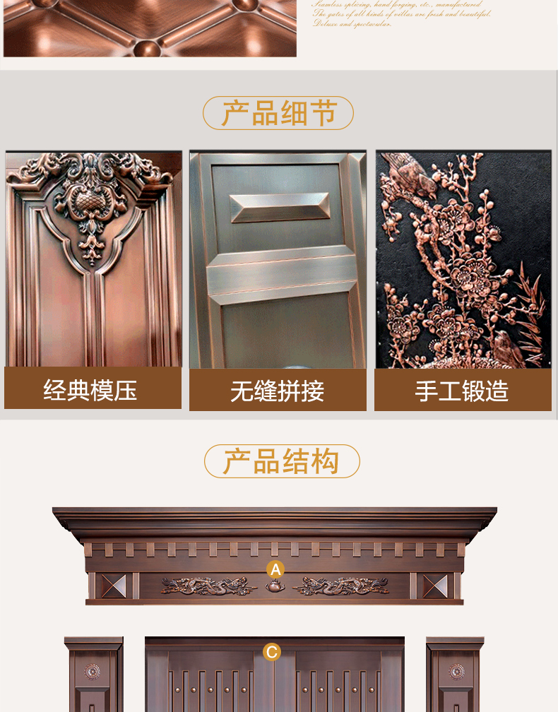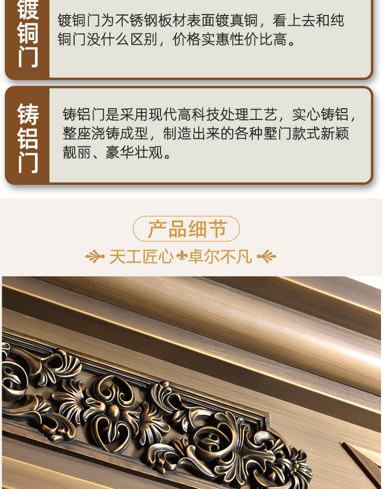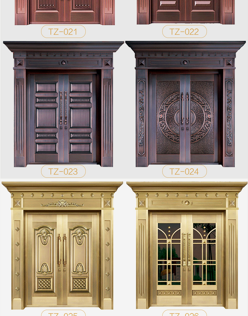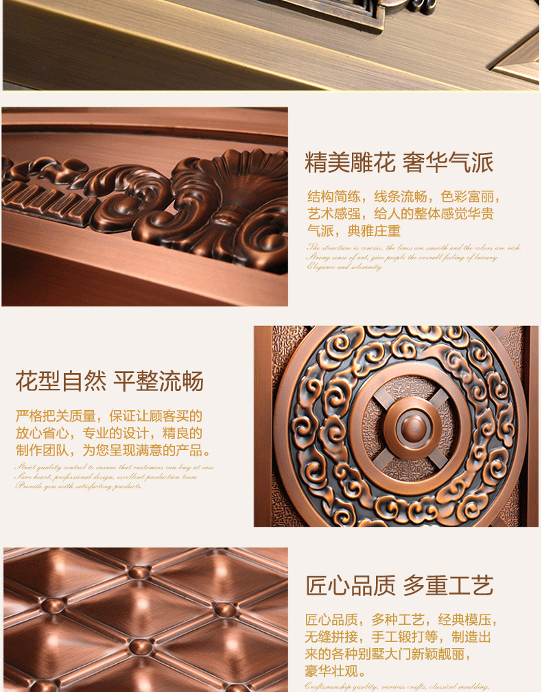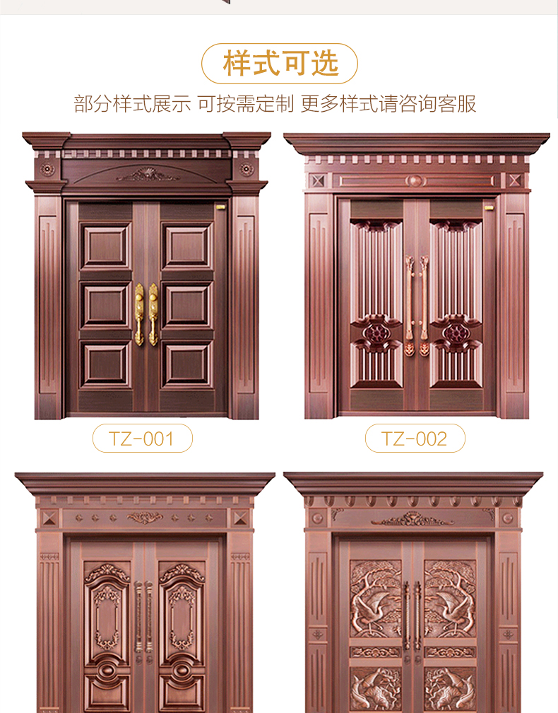 西安天卓銅門擁有經典模壓,無縫拼接,手工鍛打等多種制造工藝,制造出來的各種別墅銅門新穎靚麗,豪華壯觀。自主化生產、設計、研發,雙開、單開、子母、入戶庭院門暢銷陜西、安康、商洛、咸陽、漢中、銅川、渭南、延安、寶雞、榆林地區。